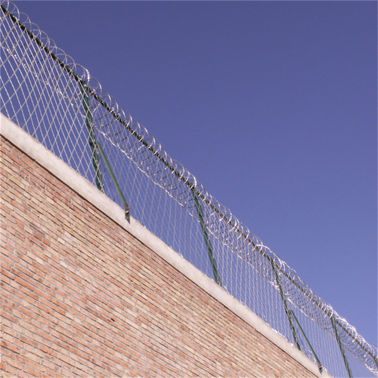 監(jiān)獄鋼網(wǎng)墻、看守所隔離網(wǎng)、機(jī)場(chǎng)圍界網(wǎng)等,大多在頂部用V型支架加裝監(jiān)獄專用不銹鋼刺刀圈,這種刺刀圈呈螺旋狀,一般多為不銹鋼材質(zhì),結(jié)構(gòu)新穎、堅(jiān)固緊密、網(wǎng)面平整、網(wǎng)孔均勻、刀鋒銳利、防攀爬、**腐蝕性強(qiáng)。