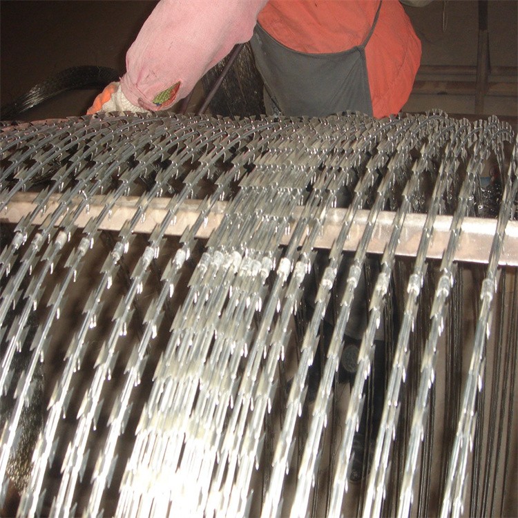 鋅層不低于270G/平方米。以免造成不必要的損失。是在兩條刀片刺網(wǎng)之間以不銹鋼片和鍍鋅鋼片強(qiáng)力夾扣,刀片刺網(wǎng)由熱鍍鋅鋼板或不銹