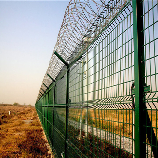 標(biāo)準(zhǔn)的機(jī)場(chǎng)圍界采用直徑5.0mm優(yōu)質(zhì)低碳鋼絲焊接,網(wǎng)孔50mm*100mm,50*200mm,也可根據(jù)要求定做。所用的立柱為60X60的矩形鋼或圓管立柱,頂端焊有V型支架,也可采用70mmX100mm的掛式連接立柱。產(chǎn)品均為熱鍍鋅后采用高質(zhì)量的聚酯粉末靜電噴涂,采用國(guó)際流行的RAL顏色。