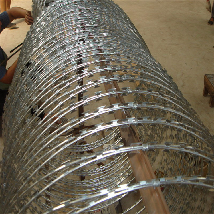 螺旋式刀片刺網(wǎng)也稱為刀片刺絲、刀片刺網(wǎng),是一種新型防護(hù)網(wǎng)。