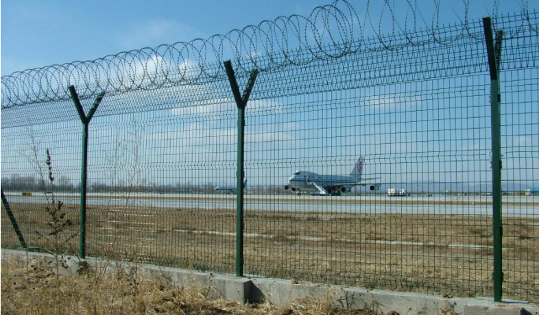 機(jī)場(chǎng)圍界網(wǎng)又稱作機(jī)場(chǎng)隔離柵“Y型安全防御護(hù)網(wǎng)”,是由V型支架立柱,加強(qiáng)型焊接片網(wǎng),安全防盜連接件和熱鍍鋅刀片刺網(wǎng)組成強(qiáng)度和安全防御性級(jí)別很高。近年來(lái),被廣泛應(yīng)用在機(jī)場(chǎng),軍事基地等高安全場(chǎng)所。