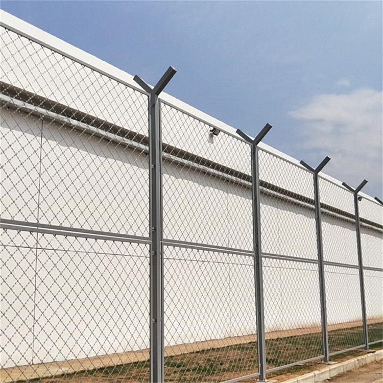 監(jiān)獄外圍鋼網(wǎng)墻內(nèi)墻鋼網(wǎng)墻圍墻鋼網(wǎng)墻-般頂端都設(shè)有V型支架與立柱焊接。材料通常選擇和立柱同等材料或者稍小規(guī)格材料搭配使用。V型支架的加裝是為了將蛇腹形刀刺網(wǎng)固定在鋼網(wǎng)墻頂部從而有效的增加監(jiān)獄鋼網(wǎng)墻的防攀爬性和安全性