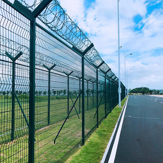 機場護欄和監(jiān)獄護欄樣式基本上是一類的,上面是Y型架托著刀片刺繩,下面是護欄網(wǎng)片,