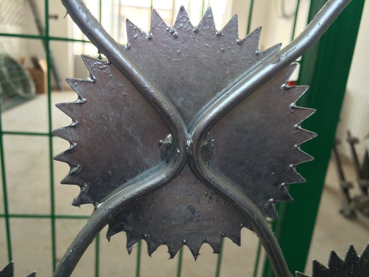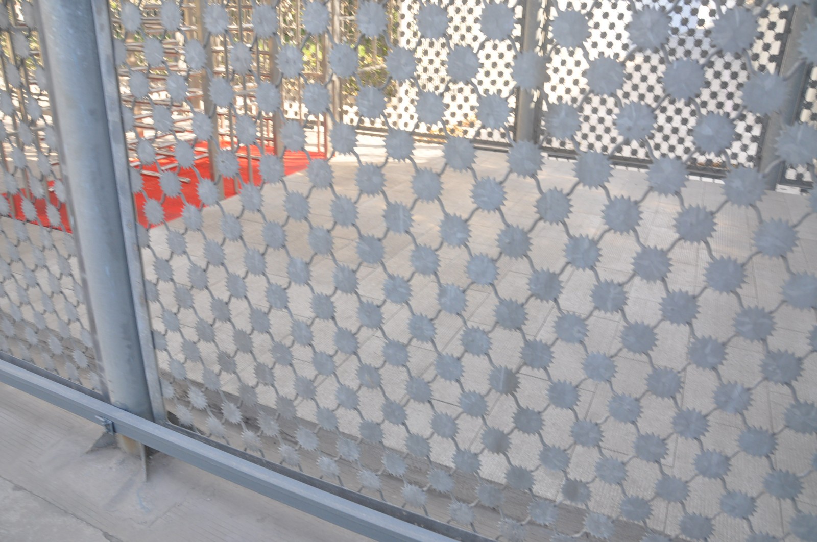 監(jiān)獄梅花刺片隔離網(wǎng)為單層梅花刺片網(wǎng),直徑不小于7.5cm,刺片厚1.5mm,采用Q235低碳鋼板沖壓成型。網(wǎng)片為菱形網(wǎng)孔,網(wǎng)格尺寸;120mm*110mm(高*寬),網(wǎng)絲直徑8mm,采用S195線材高壓焊接,每一個焊點附焊梅花刺一個。