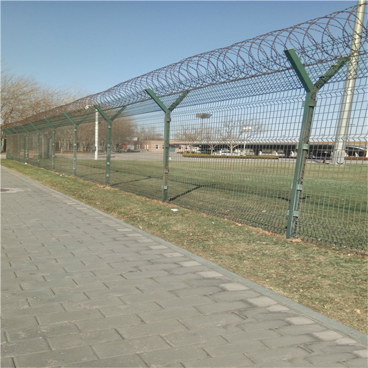 機(jī)場網(wǎng)圍欄規(guī)格常見的是:鋼筋網(wǎng)片一般為墨綠色,外形尺寸2*3m,網(wǎng)孔5*50cm,絲徑5m,上端有V型支架用來固定刀刺滾籠,加強(qiáng)二次防護(hù)功能。機(jī)場護(hù)欄網(wǎng)立柱采用80*60*6mm矩形鋼管,預(yù)埋0.5m左右,整體進(jìn)行熱鍍鋅和熱浸塑處理,防腐功能強(qiáng)、使用壽命長,是使用量很多的機(jī)場圍界樣式。