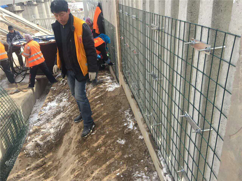 5、安裝:加密網(wǎng)寬度應(yīng)與既有柵欄等長(zhǎng),緊靠地面和兩側(cè)立柱安裝,下檻邊以上加密網(wǎng)高度應(yīng)保持950mm,加密網(wǎng)下邊緣距離地面線(xiàn)最小距離應(yīng)小于10mm。且加密網(wǎng)上邊緣高度應(yīng)與相鄰網(wǎng)片安裝高度一致平齊,做好順坡,確保美觀(guān)。