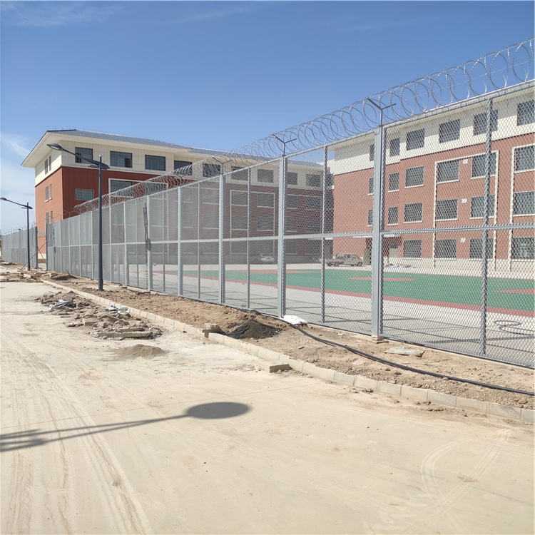 3、防攀爬v型網(wǎng)與蛇腹形刀刺網(wǎng) 防攀爬是監(jiān)獄鋼網(wǎng)墻必須必備的特點(diǎn),我們一般會(huì)在監(jiān)獄鋼網(wǎng)墻頂端架設(shè)蛇腹形刀刺網(wǎng)?,F(xiàn)在監(jiān)獄架設(shè)的蛇腹形刀刺網(wǎng)型號(hào)為BTO-22型號(hào),根據(jù)規(guī)定不同的地方架設(shè)的刀刺網(wǎng)圈經(jīng)不一樣,一般有φ50cm、φ60cm、φ80cm。 固定蛇腹形刀刺網(wǎng),需要在鋼網(wǎng)墻頂端行成一個(gè)V字型,一般有鋼筋焊接V型網(wǎng)和拉線構(gòu)成V型。架設(shè)的時(shí)候采用特定的卡扣、按照規(guī)定的間距進(jìn)行安裝就行。