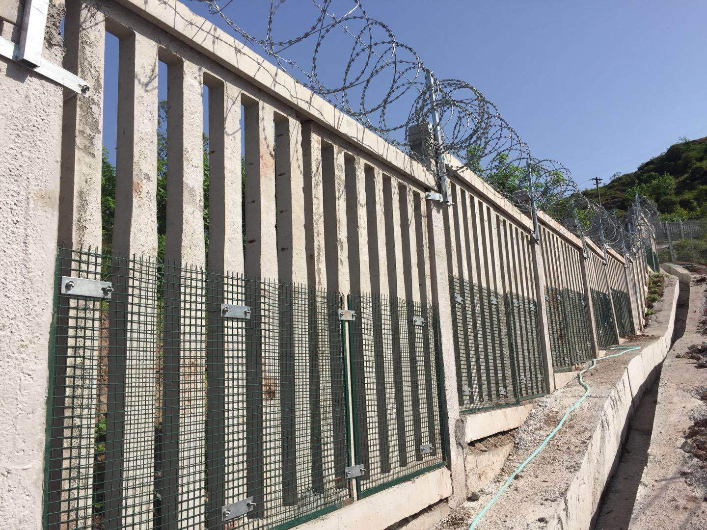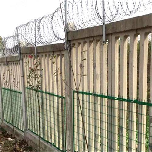 水泥柱加密網(wǎng)片之上檻防護柵欄,一般規(guī)格也分為1*3米/片、1*1.59米/片、1*1.15米/片,這種需要帶邊框也是通過抱箍進行固定,網(wǎng)片上端可以是直框也可以帶角度折彎,這種是安裝在水泥防護柵欄上部,外觀一般是墨綠色,可掛刺絲滾籠。