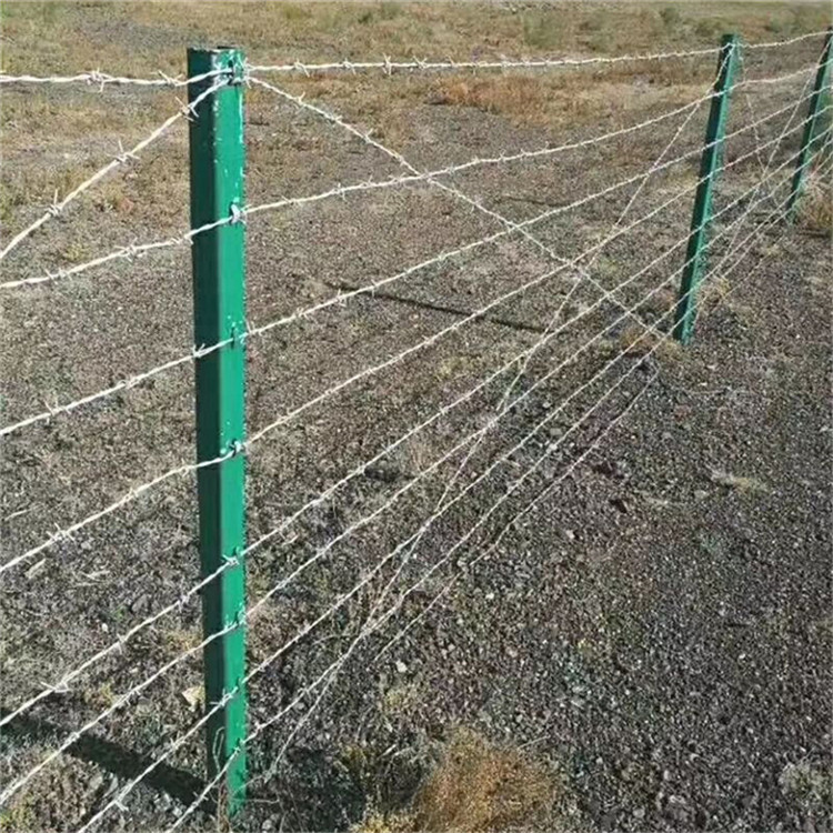 刺鐵絲為二股型熱鍍鋅鐵絲,刺鐵絲經(jīng)線為12號熱鍍鋅鋼絲,刺線為14號熱鍍鋅鋼絲,每個刺花4刺,刺長不大于2厘米,刺間距不大于10厘米,兩個刺花間不少于4個扭股,"T"型網(wǎng)樁刺鐵絲按側(cè)部14道橫絲,2道斜拉絲,頂部5道橫絲的標(biāo)準(zhǔn)架設(shè),側(cè)部刺鐵絲間距15厘米,底部刺鐵絲距離地面距離為5厘米,頂部刺鐵絲間距為20厘米,相鄰兩個立樁之間斜拉刺鐵絲與水平刺鐵絲交叉處用專用卡扣固定,方型鋼樁刺鐵絲側(cè)部按14道橫絲,2道斜拉絲,頂部3道橫絲的標(biāo)準(zhǔn)架設(shè),側(cè)部刺鐵絲間距為15厘米,底部刺鐵絲距離地面距離為5厘米,頂部刺鐵絲間距為12.4厘米,相鄰兩個立樁之間斜拉刺鐵絲與水平刺鐵絲交叉處用專用卡扣固定。