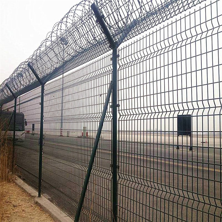機場護欄網(wǎng)又稱作“Y型安全防御護網(wǎng)”,機場隔離柵、飛機場護欄網(wǎng)是由V型支架立柱,加強型焊接片網(wǎng),安全防盜連接件和熱鍍鋅刀片刺繩組成強度和安全防御性級別很高。近年來,被廣泛應(yīng)用在機場,軍事基地等高安全場所。注:如果在機場護欄網(wǎng)頂部加裝刀片刺絲、刀片刺繩后又很好的增強了安全防護性能。采用電鍍、熱鍍、噴塑、浸塑等防腐形式,具有很好的抗老化、抗曬、耐候等特點。其產(chǎn)品造型美觀、花色多樣,既起到圍欄作用,又起到美化作用。由于具有安全性高、防攀爬能力好,網(wǎng)片連接方式采用特制SBS緊扣件,有效防止人為的破壞性拆卸,橫向四道折彎加強筋,使網(wǎng)面強度顯著增加。