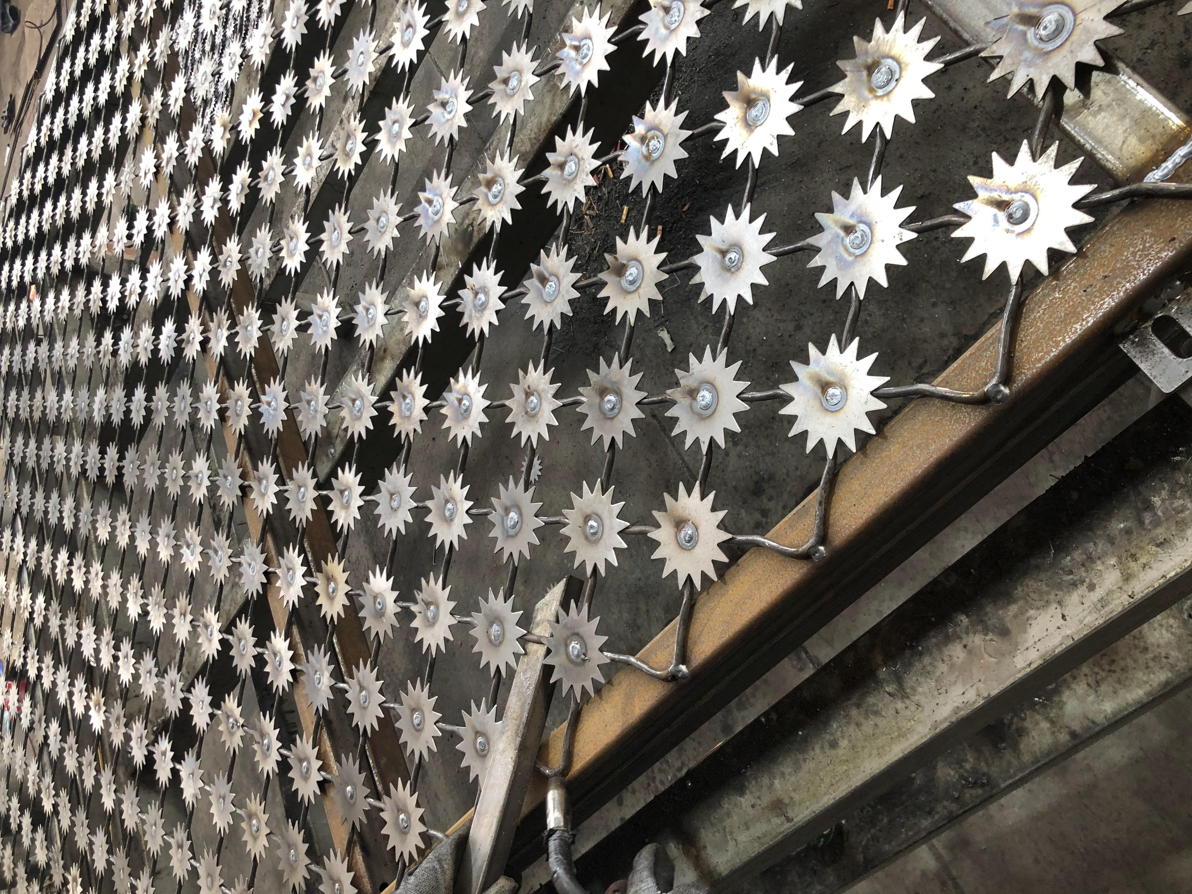 2、網(wǎng)片為菱形網(wǎng)孔,網(wǎng)格尺寸:120mm*110mm(高*寬),網(wǎng)絲直徑8mm,采用S195線材高壓焊接,每一個(gè)焊點(diǎn)附焊梅花刺一個(gè)。