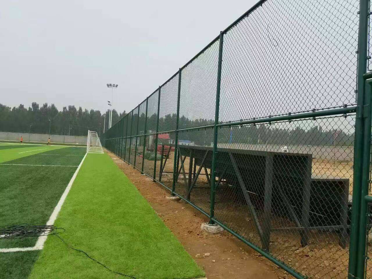 專業(yè)賽事場地側(cè)邊圍網(wǎng)建議4-6米,端線增至6-8米,全封閉場館頂部需達8米以上;訓(xùn)練及社區(qū)場地常規(guī)高度3-4米,鄰近居民區(qū)需提升至4-6米;特殊場景中,屋頂球場圍網(wǎng)高度需超6米,采用加密網(wǎng)格與加強立柱,坡地場地坡度>5°時采用階梯式安裝,立柱垂直誤差控制在0.15%以內(nèi)。