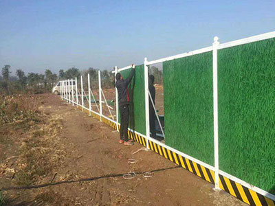 圍擋基腳采用M10水泥砂漿砌筑MU10頁(yè)巖磚磚砌0.5*0.5的基礎(chǔ),用于增強(qiáng)圍擋抗風(fēng)穩(wěn)定性;pvc圍擋設(shè)2.5米高,寬3米為一板。施工圍擋做美化處理,噴涂企業(yè)名稱(chēng)、安全、質(zhì)量、文明施工用語(yǔ)及開(kāi)發(fā)項(xiàng)目商業(yè)廣告,嚴(yán)禁張貼、涂寫(xiě)垃圾廣告。