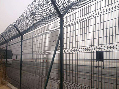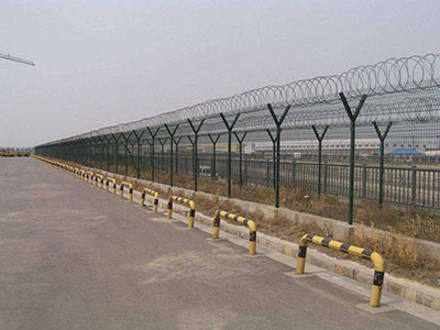 機(jī)場護(hù)欄網(wǎng)又稱作“Y型安全防御護(hù)網(wǎng)”,是由V型支架立柱加強(qiáng)型焊接片網(wǎng),安全防盜連接件和熱鍍鋅刀片刺網(wǎng)組成強(qiáng)度和安全防御性級別很高。被廣泛應(yīng)用在機(jī)場,軍事基地等高安全場所。