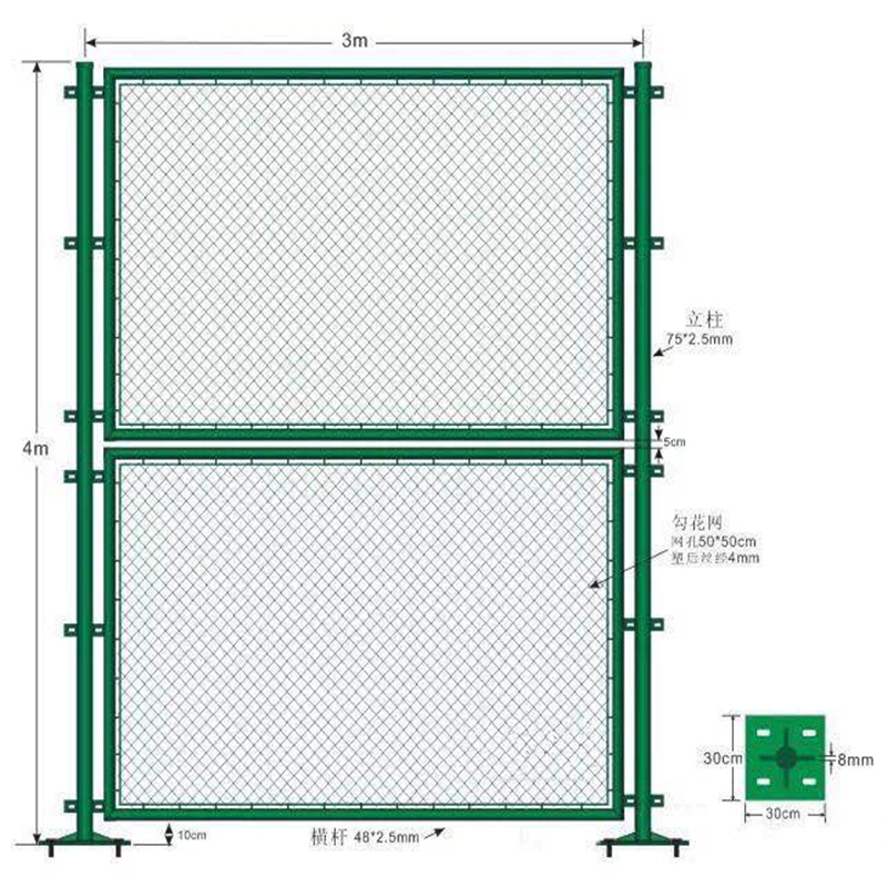 1、為保證體育場圍欄網(wǎng)有足夠的剛度,避免產(chǎn)生令人擔(dān)心的搖晃現(xiàn)象,對于足球場圍網(wǎng)高度有特殊要求的,比如高度要求大于3m時,建議圍網(wǎng)立柱直徑應(yīng)不小于70mm,立柱壁厚不小于3mm。為了增加安全儲備本單位建議管壁厚度為4mm.