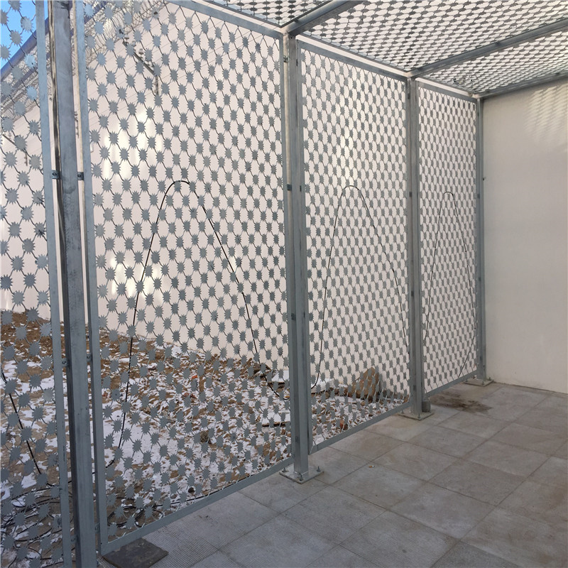監(jiān)獄梅花刺鋼網(wǎng)墻又稱(chēng)監(jiān)獄護(hù)欄網(wǎng)或監(jiān)獄隔離柵,主要是采用高強(qiáng)度的刀片刺網(wǎng)與普通防護(hù)網(wǎng)的結(jié)合,由V型支架立拄,加強(qiáng)型焊接片網(wǎng),安全防盜連接件和刀片刺網(wǎng)組成。刀片刺網(wǎng)是一種新型防護(hù)網(wǎng),由銳利尖角鍍鋅鋼板或不銹鋼薄板做刀片,鋼絲做芯線(xiàn)組合而成的防護(hù)器材梅花刺網(wǎng)又稱(chēng)高安全防護(hù)網(wǎng)、監(jiān)獄防護(hù)網(wǎng),是用氬弧焊將梅花形刺片焊接在美格網(wǎng)的節(jié)點(diǎn)上,形成刺形保護(hù),有效的防止了手握腳攀,為此該鋼網(wǎng)墻在監(jiān)獄或看守所使用。