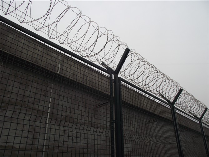 4、刀刺網(wǎng)每圈刀刺間隔100mm,每米刀刺不少于10圈。刀刺網(wǎng)安裝固定卡扣整體調(diào)正,使刀刺網(wǎng)不出現(xiàn)擰轉(zhuǎn)情況,刀刺刺圈分布均勻,每隔20米與拉絲固定;分段連接處需將兩端刀刺網(wǎng)做連接固定,刀刺網(wǎng)固定點(diǎn)需緊鎖不得,出現(xiàn)松動(dòng)、脫落現(xiàn)象;刀刺網(wǎng)安裝與隔離網(wǎng)平行,上下左右均成直線延伸,轉(zhuǎn)角處需做加密加固處理。