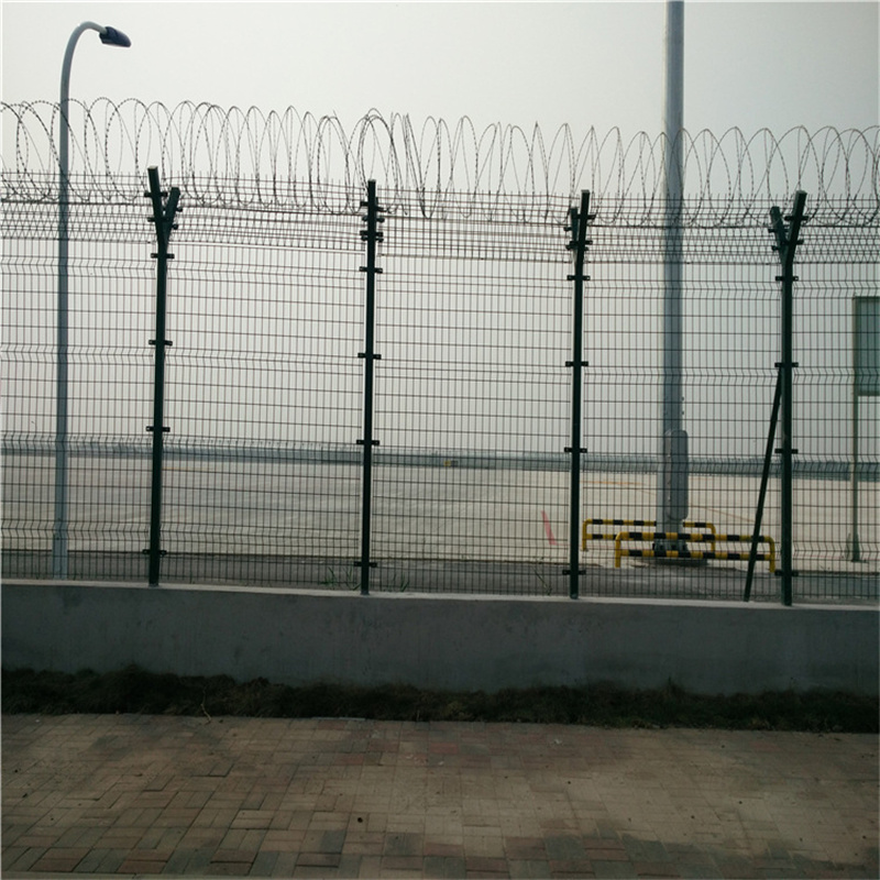 機場鋼筋圍界網(wǎng)頂部加裝刀片刺絲、刀片刺網(wǎng)后又很好的增強了安全防護性能。采用電鍍、熱鍍、噴塑、浸塑等防腐形式,具有很好的抗老化、抗曬、耐腐蝕等特點。其產(chǎn)品造型美觀、花色多樣,既起到圍欄作用,又起到美化作用。由于具有安全性高、防攀爬能力好,網(wǎng)片連接方式采用特制SBS緊扣件,有效防止人為的破壞性拆卸,橫向四道折彎加強筋,使網(wǎng)面強度顯著增加。