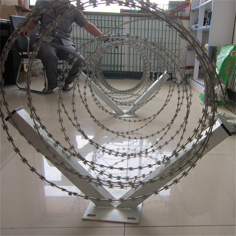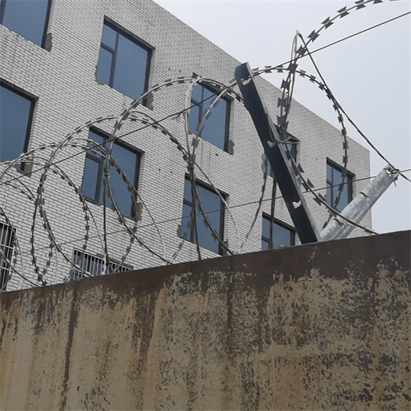 刀片刺繩在安裝過程中,可以根據(jù)圍墻的長度實(shí)際使用多少根Y字型支架,一般為3-4米為宜,把Y型支架固定在墻的上面,其中Y型支架可根據(jù)實(shí)際情況進(jìn)行打孔,從而安裝刺網(wǎng)的時(shí)候,起到固定作用。之后,在刀片刺網(wǎng)的Y型支架兩側(cè)各拉一根鋼絲,對刺網(wǎng)進(jìn)行固定,避免左右晃。安裝刀片刺繩的時(shí)候要注意的事項(xiàng)也是很多的,但是首先要注意的是自身安全,由于刀片刺繩刀口設(shè)計(jì)的原因遭到割傷后傷口不好愈合,所以在安裝時(shí)要先保證自身的安全。首先一副比較厚的勞保手套是必不可少的,因?yàn)橹翱蛻舴从尺^說用普通手套結(jié)果割破了兩雙,所以為了保護(hù)咱們的雙手受到不必要的傷害,一定要帶好手套防止受傷。其次刀片刺繩安裝時(shí)需要兩個(gè)人同時(shí)進(jìn)行安裝防止一個(gè)人安裝時(shí)由于回彈導(dǎo)致受傷。