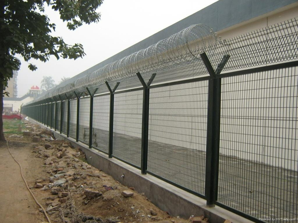 監(jiān)獄網(wǎng)墻設(shè)計要求:整體固定連貫一致,標(biāo)準(zhǔn)生產(chǎn)質(zhì)量,框網(wǎng)方正,對角線誤差不大于2cm。監(jiān)獄隔離網(wǎng)網(wǎng)面安裝離地距離5-8cm,框網(wǎng)與立柱采用螺栓固定邊耳式連接網(wǎng)頁每邊與立柱連接點不少于六處。立柱采用水泥澆灌預(yù)埋式,規(guī)格為600*600*600mm (長*寬*深),底座四角預(yù)制四個直徑25mm熱鍍鋅螺栓(每個螺栓中心為距基礎(chǔ)兩邊150mm的交叉點),從頂端往下絲長不小于150mm (與地籠焊為一體),螺栓高于底座平面50mm (底座平面應(yīng)與所在位置最終地面高度在同一水平高度),螺栓間距為300mm*300mm,與立柱法蘭盤螺孔相適應(yīng)。立柱保持豎直、不歪斜。立柱做調(diào)直處理,每20米校正,每100米偏差角度不大于5°,安裝整體無歪斜,隔離網(wǎng)整體呈直線(除地形需要做出適宜角度外)。