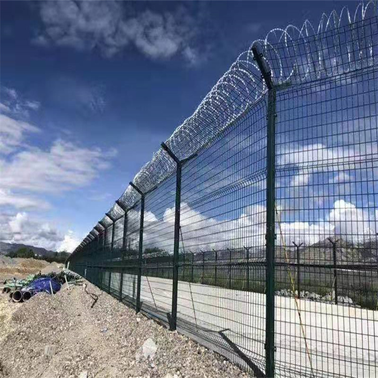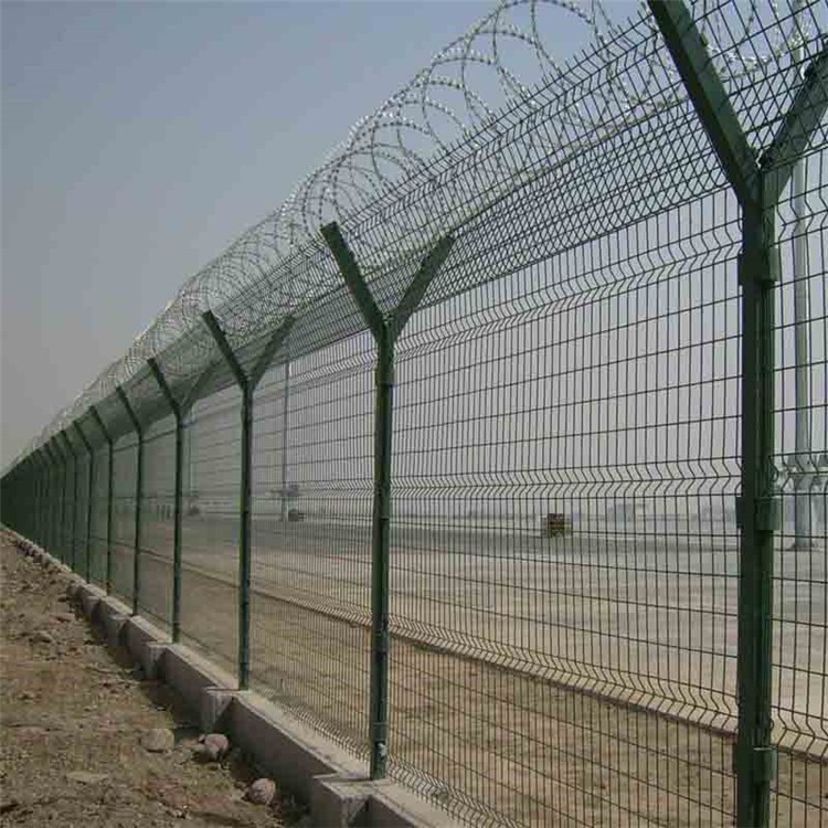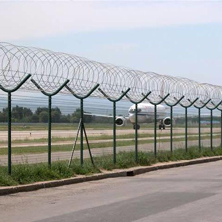 機場護欄網(wǎng)又稱作“Y型安全防御護網(wǎng)”,是由V型支架立柱加強型焊接片網(wǎng),安全防盜連接件和熱鍍鋅刀片刺網(wǎng)組成強度和安全防御性級別很高。被廣泛應(yīng)用在機場,基地等高安全場所。