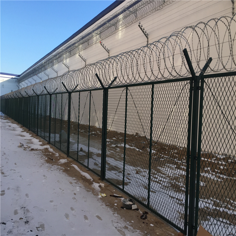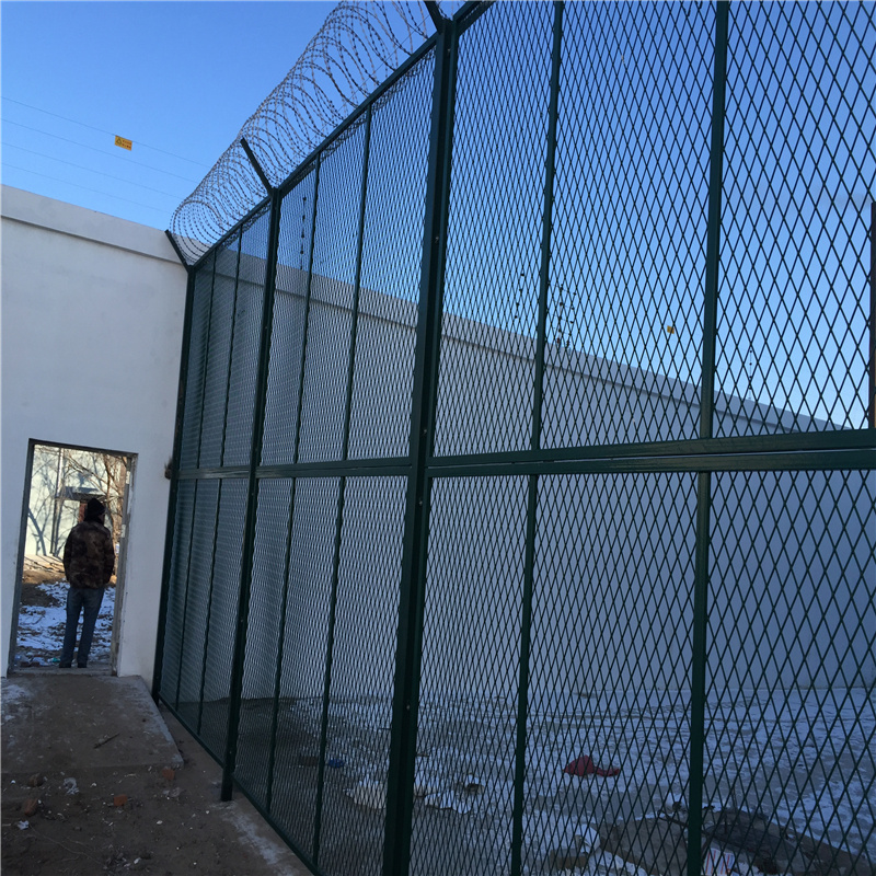 監(jiān)獄鋼網(wǎng)墻一般帶有邊框,邊框尺寸一般為20*30mm、30*40mm、30*50mm等等,邊框增強(qiáng)了鋼網(wǎng)墻的牢固性。鋼筋焊接鋼網(wǎng)墻的立柱一般采用60*60/80*80/100*100等的方形鋼管焊接而成,厚度采用3mm以上能夠有更好的牢固作用。防攀爬是監(jiān)獄鋼網(wǎng)墻必須必備的特點(diǎn),我們一般會(huì)在監(jiān)獄鋼網(wǎng)墻頂端架設(shè)蛇腹形刀刺網(wǎng)。現(xiàn)在監(jiān)獄架設(shè)的蛇腹形刀刺網(wǎng)型號(hào)為BTO-22型號(hào),根據(jù)規(guī)定不同的地方架設(shè)的刀刺網(wǎng)圈經(jīng)不一樣,一般有φ50cm、φ60cm、φ80cm。