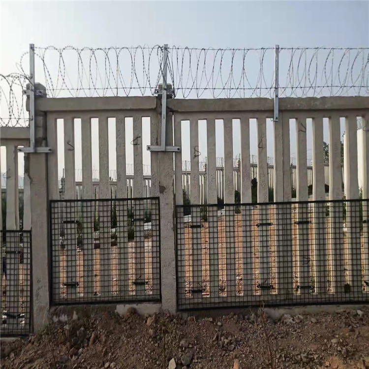 刺絲滾籠安裝由土字支架、一字加密支架、抱箍組成,鐵路刀刺網(wǎng)支架-刺絲滾籠 土字支架 定做角鋼折彎柱,鐵路刺絲滾籠新建鐵路時(shí)速200公里以上,采用2.2米高度鋼筋混凝土防護(hù)柵欄+0.5米刺絲滾籠,設(shè)計(jì)時(shí)速200公里以下鐵路,一般地段采用1.8米高度鋼筋混凝土防護(hù)柵欄+0.5米刺絲滾籠,刺絲滾籠采用刀片刺繩繞圈后相鄰兩圈每隔120°用鐵絲連接卡固定,張開(kāi)后形成蛇腹網(wǎng)狀,閉合后刀片刺繩圈徑為50cm,張開(kāi)后每交叉圈安裝間距20cm,直徑不小于45cm,刺絲滾籠下緣距離鋼筋混凝土防護(hù)柵欄上緣的垂直距離為0.05米。