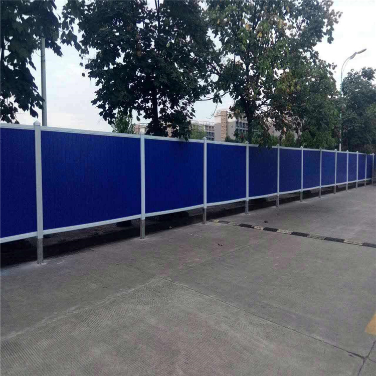 施工圍擋采用藍色輕質(zhì)夾心彩鋼板,彩鋼厚度為0.3mm,高度2米,圍擋頂部及底部分別設(shè)置10cm高的鋼槽壓頂和鋼槽托底,每隔2.9米設(shè)一個錨固于地面的鋼立柱,立柱下座為50cm×50cm×50cm的C25砼基礎(chǔ),鋼柱底板四角采用膨脹螺栓與混凝土基礎(chǔ)連接固定,既可以減少占地,又可讓圍擋穩(wěn)固、整齊、美觀
